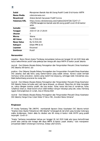 "Aneka Tambang menyatakan bahwa per tanggal 26 Juli 2020 tidak ada kasus terkonfirmasi