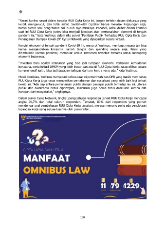 pandemi ini," kata Yustinus dalam rilis survei "Penilaian Publik Terhadap RUU Cipta Kerja dan