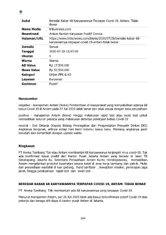 negative - manajemen Antam (None) Pemberitaan di masyarakat yang menyebutkan adanya 68