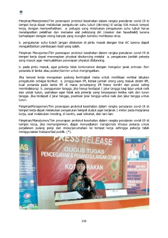 b. pada pintu masuk, agar pekerja tidak berkerumun dengan mengatur jarak antrean. Beri