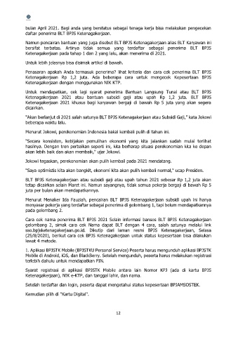 Ketenagakerjaan 2021 atau bantuan subsidi gaji atau upah Rp 1,2 juta. BLT BPJS