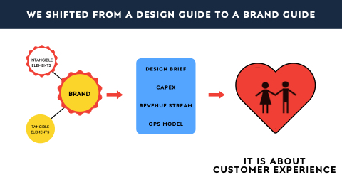 We shifted from a design guide to a brand guide inTangible intangible elements elements Design brief CapEx Revenue stream ops model brand TAaNnGgIiBbLlEe elements It is about customer experience