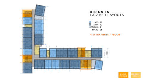 BTR units 1 & 2 bed layouts 1B2P - 12 2B4P - 12 STUDIO - 2 TOTAL - 26 4 extra units / floor living module Bedroom module 6,000 7,750