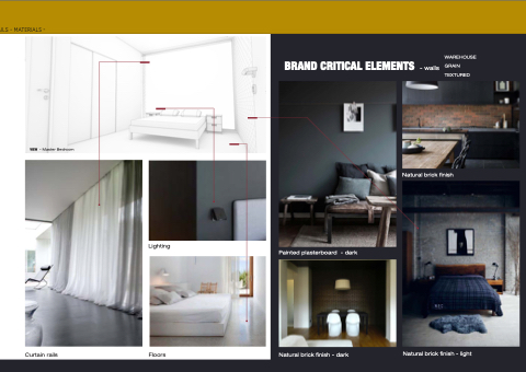 - - - - - - - - materials - - BRAND CRITICAL ELEMENTS - walls WAREHOUSE GRAIN TEXTURED Natural brick finish Painted plasterboard - dark Natural brick finish - dark Natural brick finish - light VIEW - Master Bedroom Lighting Curtain rails Floors