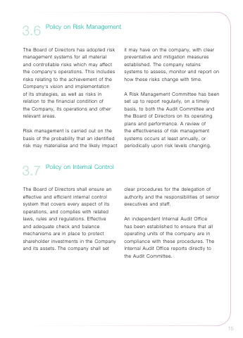3.6 Policy on Risk Management The Board of Directors has adopted risk management systems for all material and controllable risks which may affect the company’s operations. This includes risks relating to the achievement of the Company’s vision and implementation of its strategies, as well as risks in relation to the financial condition of the Company, its operations and other relevant areas. Risk management is carried out on the basis of the probability that an identified risk may materialise and the likely impact 3.7 Policy on Internal Control The Board of Directors shall ensure an effective and efficient internal control system that covers every aspect of its operations, and complies with related laws, rules and regulations. Effective and adequate check and balance mechanisms are in place to protect shareholder investments in the Company and its assets. The company shall set it may have on the company, with clear preventative and mitigation measures established. The company retains systems to assess, monitor and report on how these risks change with time. A Risk Management Committee has been set up to report regularly, on a timely basis, to both the Audit Committee and the Board of Directors on its operating plans and performance. A review of the effectiveness of risk management systems occurs at least annually, or periodically upon risk levels changing. clear procedures for the delegation of authority and the responsibilities of senior executives and staff. An independent Internal Audit Office has been established to ensure that all operating units of the company are in compliance with these procedures. The Internal Audit Office reports directly to the Audit Committee. 15