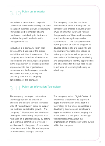 3.10 Policy on Innovation Innovation is one value of corporate culture that drives collaborating practices to support business growth, encouraging knowledge and technology sharing mechanism contributing to business’s sustainable growth and efficiently manage resources. Innovation is a company vision that drives all the business of the group and all the activities it carries out. The company established an infrastructure that enables and encourages all people in the organization to propose potential improvement to the organization’s processes and technologies, promote innovation activities, focusing on efficiency aimed at the ongoing optimization of the company. The company promotes practices the innovation culture throughout the company and creates motivating work environments that favor and reward the generation of ideas and innovative practices by recognizing creative contributions. The company creates training course or specific program to develop skills relating to creativity and incorporate innovation into relevance training subjects as well as promote a mechanism of technological monitoring and prospecting to identify opportunities and challenges for the business to act in advance of technological changes effectively. 3.11 Policy on Information Technology The company developed information technology system to provide an effective and secure services complied with IT related laws in order to support the business sustainable growth. The company IT Master plan has also been developed to effectively response to a revolution of digital technology by setting up a working committee to oversee IT architecture for the group of companies to be transparent, flexible and response to the business strategic direction. The company set up Digital Center of Excellence Department to cope with digital transformation and adapt the technology to the fullest capabilities in developing business and employee’s digital capabilities and encouraging the anticipation in a fast-pace technology transformation throughout the organization in creating new work culture within the company. 17