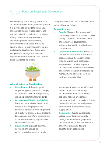3.14 Policy on Sustainable Development The company has a strong belief that an industry would be vigorous only when it is developed in tandem with social and environmental responsibility. We are dedicated to conduct our business with good corporate governance and management of economics, environmental and social risks and opportunities. In every location, we put sustainable development framework into practice through the effective implementation of international best-in- class standards to create Value Creation to Stakeholders • Compliance: Adhere to good corporate governance and comply to stipulated laws and regulations, including international standards • Occupational Health and Safety: Care for occupational health and safety of our employees and business partners by the alignment of 3 safety principles; Zero incident, Zero repeat, and Zero compromise, to eliminate fatalities, injuries and occupational illness. • Environment: Balance business development alongside environmental protection, study Competitiveness and Value creation to all stakeholders as follows Competitiveness • People: Respect for employees’ human rights by fair treatment, build strong corporate culture enhance, and employee development, enhance leadership and technical competency. • Operational Excellence: Focus on the flexible and efficient business process along the supply chain with innovation and continuous improvement, provide superior products and services to customers and enhance customer relationship management, and seek for new business opportunities. and evaluate environmental impact before project implementing as preventive measure in every projects, reduce or optimize resource utilization, provide pollution prevention at sources and proper environment management along supply chain. • Community: Create sustainable values to our host community through community engagement, tax contribution, local employment and other programs toward stakeholders’ acceptance 19