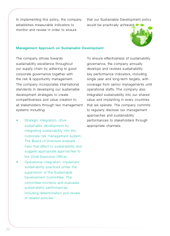 In implementing this policy, the company that our Sustainable Development policy establishes measurable indicators to would be practically achieved. monitor and review in order to ensure Management Approach on Sustainable Development 20 The company strives towards sustainability excellence throughout our supply chain by adhering to good corporate governance together with the risk & opportunity management. The company incorporates international standards in developing our sustainable development strategies to create competitiveness and value creation to all stakeholders through two management systems including: • Strategic integration: drive sustainable development by integrating sustainability into the corporate risk management system. The Board of Directors evaluate risks that affect to sustainability and suggest appropriate approaches to the Chief Executive Officer. • Operational integration: implement sustainability practices under the supervision of the Sustainable Development Committee. The committee monitors and evaluates sustainability performances including determination and review of related policies. To ensure effectiveness of sustainability governance, the company annually develops and reviews sustainability key performance indicators, including single year and long-term targets, with coverage from senior managements until operational staffs. The company also integrated sustainability into our shared value and implanting in every countries that we operate. The company commits to regularly disclose our management approaches and sustainability performances to stakeholders through appropriate channels.