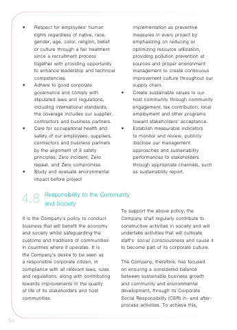 54 • Respect for employees’ human rights regardless of native, race, gender, age, color, religion, belief or culture through a fair treatment since a recruitment process together with providing opportunity to enhance leadership and technical competencies. • Adhere to good corporate governance and comply with stipulated laws and regulations, including international standards, the coverage includes our supplier, contractors and business partners. • Care for occupational health and safety of our employees, suppliers, contractors and business partners by the alignment of 3 safety principles; Zero incident, Zero repeat, and Zero compromise. • Study and evaluate environmental impact before project implementation as preventive measures in every project by emphasizing on reducing or optimizing resource utilization, providing pollution prevention at sources and proper environment management to create continuous improvement culture throughout our supply chain. • Create sustainable values to our host community through community engagement, tax contribution, local employment and other programs toward stakeholders’ acceptance. • Establish measurable indicators to monitor and review, publicly disclose our management approaches and sustainability performances to stakeholders through appropriate channels, such as sustainability report. 4.8 Responsibility to the Community and Society It is the Company’s policy to conduct business that will benefit the economy and society whilst safeguarding the customs and traditions of communities in countries where it operates. It is the Company’s desire to be seen as a responsible corporate citizen, in compliance with all relevant laws, rules and regulations, along with contributing towards improvements in the quality of life of its stakeholders and host communities. To support the above policy, the Company shall regularly contribute to constructive activities in society and will undertake activities that will cultivate staff’s’ social consciousness and cause it to become part of its corporate culture. The Company, therefore, has focused on ensuring a considered balance between sustainable business growth and community and environmental development, through its Corporate Social Responsibility (CSR) in- and after- process activities. To achieve this,