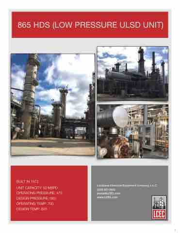 865 HDS (LOW PRESSURE ULSD UNIT) BUILT IN 1972 UNIT CAPACITY: 50 MBPD OPERATING PRESSURE: 470 DESIGN PRESSURE: 583 OPERATING TEMP: 700 DESIGN TEMP: 825 Louisiana Chemical Equipment Company, L.L.C. (225) 923-3602 plants@LCEC.com www.LCEC.com 7
