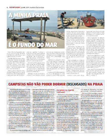 A verdade é que os campistas estão nas primeiras linhas dos amantes da natureza e, naturalmente, da praia. Frequentam as nossas praias desde o alvor daquela prá- tica em Portugal e não admira a sua pre- sença tão clara nas nossas praias. Já há muito tempo que, além do campista da natureza, multiplicou-se o campista de conveniência, explorando uma forma