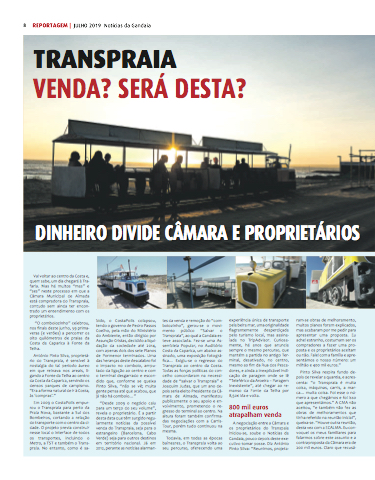 50€ ida e e e e e volta ram-se obras de melhoramento muitos planos foram explicados mas acabaram por me me me pedir para apresentar uma uma uma proposta Eu achei estranho costumam ser os os os os os os compradores a a a a a a a a a a a a a a a a a a a fazer uma uma uma pro- posta e e e e e e e e e e e e e os os os os os os os proprietários aceitam ou não Falei com com a a a a a a a a a a a a família e e e e e e e e e e e e apre- sentámos o o o o o o o o o o o o o o nosso número: um milhão e e e e e 400 mil mil euros ” António Pinto Silva proprietá- rio do do do Transpraia é sensível à nostalgia do do do do tal tal período áureo em que reinava nos nos areais li- gando a a a a a a a a a a a a a a a a a a a a Fonte da da da Telha ao centro da da da Costa Costa da da da Caparica servindo os os os os os densos parques de de de campismo “Era a a a a a a a a a a a a a a a forma natural de de de ir à à Costa Costa às ‘compras’ ” Em 2009 o o o o o o o o o CostaPolis empur- rou o o o o o o o o o o o o o Transpraia para perto da Praia Nova bastante a a a a a a a a a a a a a a a a a a Sul dos Bombeiros cortando a a a a a a a a a a a a a a a a a a a relação do do do do transporte com o o o o o o o o o o o o o o o o o o o centro da da ci- dade O projeto previa construir nesse local o o o o o o o o o o o o o o o o o o interface de de todos os os transportes incluindo o o o o o o o o o o o o o o o o o Metro a a a a a a a a a a TST e e e e e e e e e também o o o o o o o o o o o o o o Trans- praia No entanto como é é sa- “Desde 2009 o o o o o o o o o o o o negócio caiu para um um terço do do seu volume” revela o o o o o o o o o o o proprietário É a a a a a a a a a a a a partir desta data que têm surgido regu- larmente notícias da da da possível venda do do Transpraia seja seja para para o o o o o o o o o o o estrangeiro (Barcelona Cabo Verde) seja seja para para outros destinos em em território nacional Já em em 2012 perante as as notícias alarman-