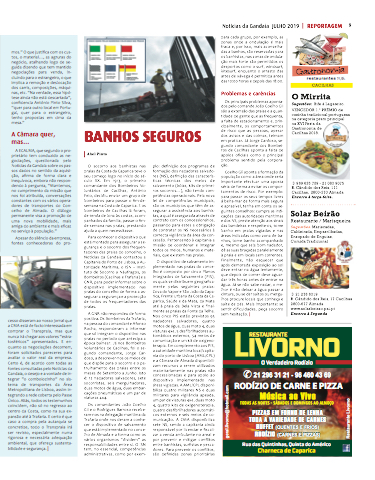 de Cacilhas 2018 | Abel Pinto O socorro aos banhistas nas praias da da Costa da da Caparica teve o o o o o o o o o o o o o o o o seu começo logo no início do do sé- culo XX Em 1913 o o o o o o o o o o o o o o o o o o o primeiro comandante dos Bombeiros Vo- luntários de de de de Cacilhas António Feio decidiu enviar um grupo de de de de de bombeiros bombeiros para passar o o o o o o o o o o o o fim-de- semana na na na Costa de de de de de de de Caparica E os os os os os bombeiros bombeiros de de de de de Cacilhas lá foram de de de de de tenda de de de de de lona às costas acom- panhados da da da família passar o o o o o o o o o fim- de-semana nas praias prestando ajuda a a a a a a a a a a a a a a a a a a quem necessitasse plo: definição definição dos dos programas de de de formação dos dos dos nadadores salvado- res res (NS) definição definição das caracterís- ticas técnicas dos dos meios de de de salvamento (bóias kits de de de primei- ros ros socorros ) não tendo com- petências petências operacionais Pela nova lei de de competências municipais são os os os municípios que têm de de de as- segurar a a a a a a a a a a a a a a a a a a assistência aos banhis- tas a a a a a a a a a a a a a a a a a a a a a a qual é é assegurada através de de contrato com os os os os os concessionários passando para estes a a a a a a a a a a a a a a a a a a a a a a obrigação de contratar os os os os NS necessários à à correcta vigilância da da área da da con- cessão Pertencendo à à capitania a a a a a a a a a a a a a a a missão de de coordenar e e e e e e e e e e e e e e e e integrar todos os os os os meios humanos e e e e e e e e e e e e e e mate- riais que existem nas praias Coelho Gil aponta a a a a a a a a a a a a a a formação da população como a a a a a a a a a a a a a a a a a a área onde seria importante efectuar uma aposta séria de de de forma a a a a a a a a a a a a a a a a a a evitar os os os os os compor- tamentos de de de risco Por exemplo: para passar os os os os os seus tempos livres á beira-mar de de forma mais segura e e e e e e e e e e e e e e e aprazível tenha em em conta os os os os se- guintes conselhos: cumpra as as as indi- cações das das autoridades marítimas e e e e e e e e e e e e e e e e dos NS preste atenção aos sinais das das das das bandeiras e e e e e e e e e e e e e e e e respeite-os tome banho banho em praias vigiadas e e e e e e e e e e e e e e e nas áreas indicadas como zona de de ba- nhos tome banho banho acompanhado e e e e e e e e e e e e e e e mesmo que seja bom nadador dê as as as suas braçadas paralelamente à praia e e e e e e e e e e e e e e e e e e e e em em em locais sem correntes Finalmente não esquecer que que após demorada exposição ao sol deve deve entrar entrar na n na na água lentamente que depois de de de de de de comer deve deve aguar- dar dar três horas antes de de de de de de entrar entrar na na n na n água água Já se se não não sabe nadar o o o o o o o o o o me- lhor é não não deixar a a a a a a a a a a a a a a a a a a a água água passar a a a a a a a a a a a a a a a a a a a cintura ou ou se se se der saltos ou ou mergu- lhos procure locais que conheça e e e e e e e e e e e e e e e salte de de de pés Mais importante: se se se se sentir dificuldades peça socorro sem hesitação | 969 635 759 - - 21 080 9075 R R Cândido dos Reis 111 Cacilhas 2800-270 Almada Encerra à terça-feira A A GNR não respondeu de de forma positiva Os Bombeiros da da Trafaria n na na pessoa do comandante Afonso Rocha responderam a a a a a a a a a a a a a a a a a a a a informar que que só integram o o o o o o o o o o o o o o o o o o dispositivo nas praias no no período que que antecipa a a a a a a a a a a a a a a a a época balnear Já nos Bombeiros Voluntários de de de Cacilhas foi o o o o o o o o o o o o o o o o o o o se- gundo comandante Jorge Car- doso a a a a a a a a a a a a a descrever-nos os os os os os os meios de de de que dispõe para o o o o o o o o o o o o o o o o o o socorro e e e e e e e e e e e e e e e e e e o o o o o o o o o o o o o o o o o o pa- trulhamento das praias entre os os os os os meses de Setembro a a a a a a a a a a a a a a Junho Isto é: 12 nadadores salvadores sete socorristas seis mergulhadores duas duas motos de de água duas duas embar- cações pneumáticas e e e e e e e e e um um par de de viaturas 4x4 Música ao Vivo