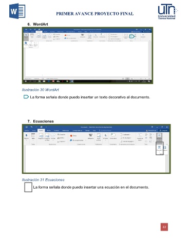 PRIMER AVANCE PROYECTO FINAL 6. WordArt Ilustración 30 WordArt La forma señala donde puedo insertar un texto decorativo al documento. 7. Ecuaciones Ilustración 31 Ecuaciones La forma señala donde puedo insertar una ecuación en el documento. 22