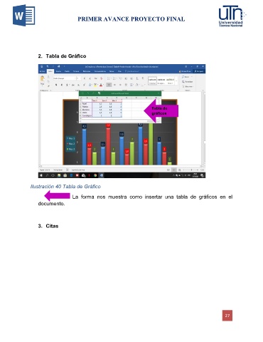 PRIMER AVANCE PROYECTO FINAL 2. Tabla de Gráfico Tabla de gráficos Ilustración 40 Tabla de Gráfico La forma nos muestra como insertar una tabla de gráficos en el documento. 3. Citas 27