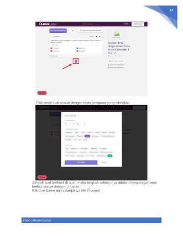 14 Pilih detail kuis sesuai dengan mata pelajaran yang diberikan. Setelah soal berhasil di buat, maka langkah selanjutnya adalah mengunggah soal berikut sesuai dengan tahapan. Klik Live Game dan selanjutnya klik Proceed E-BOOK BELAJAR QUIZIZZ