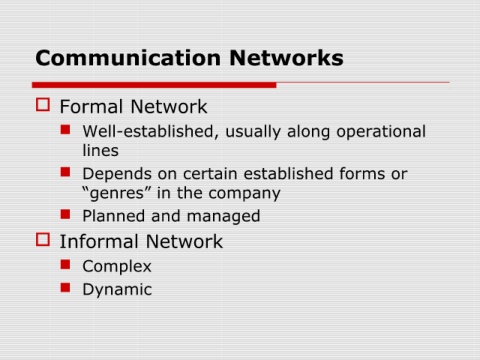 Communication Networks Formal Network Well-established, usually along operational lines Depends on certain established forms or “genres” in the company Planned and managed Informal Network Complex Dynamic