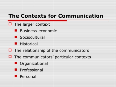 The Contexts for Communication The larger context Business-economic Sociocultural Historical The relationship of the communicators The communicators’ particular contexts Organizational Professional Personal