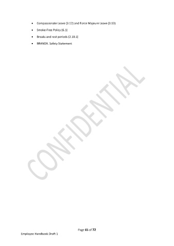 • Compassionate Leave (3.12) and Force Majeure Leave (3.13) • Smoke-Free Policy (6.1) • Breaks and rest periods (2.10.1) • BRANDX. Safety Statement Page 65 of 72 Employee Handbook Draft 1