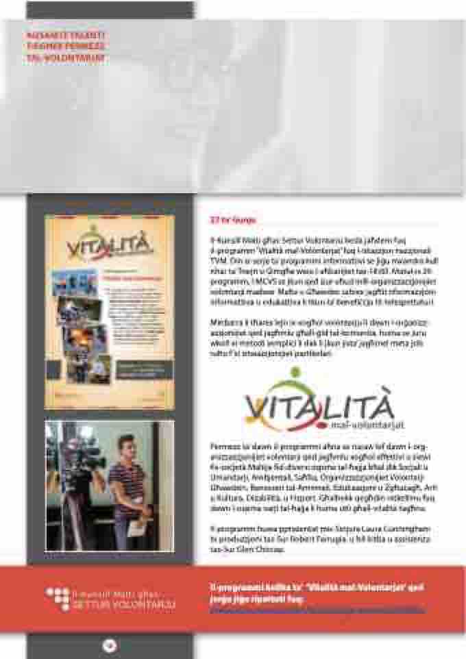 Il-programmi kollha ta’ ‘Vitalità mal-Volontarjat’ qed jerġu jiġu ripettuti fuq: www.tvm.com.mt/mt/tvmi/programmes/vitalita/