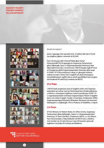 skont l-appoġġ minn partijiet terzi It-talbiet taħt dan il-Fond ma jistgħux jaqbżu l-ammont ta’ €5 000 Dan il-fond jaqa’ taħt il-Kunsill Malti għas-Settur Volontarju(MCVS) bl-appoġġ tas-Segretarju Parlamentari għaż-Żgħażagħ Sport u u u u Organizzazzjonijiet Volontarji Biex tikkumplimenta dan l-avveniment l-MCVS ħarġet tagħrif ‘Fond ta’ Emerġenza għall-Organizzazzjonijiet Volontarji għal għal waqt il-COVID-19” li fiha tenfasizza l-iskop u u l-għanijiet ewlenin relatati ma’ dan il-fond Dan it-tagħrif kif ukoll animazzjoni tal-pubblikazzjoni tagħha kienu wkoll ippubblikati fuq fuq il-paġna tal-Facebook kif ukoll fuq il-website tal-MCVS 20 ta’ Mejju