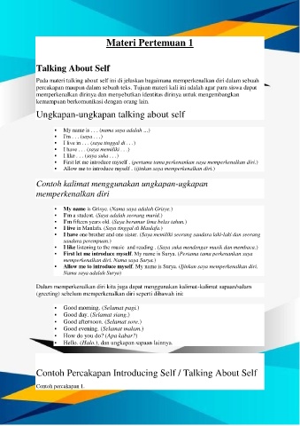 Pada materi talking about self ini di jelaskan bagaimana memperkenalkan diri dalam sebuah
