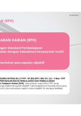 • Rancangan Pelajaran Harian (RPH) : Merupakan terjemahan RPT yang