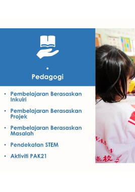 • Pedagogi • Pembelajaran Berasaskan Inkuiri • Pembelajaran Berasaskan Projek • Pembelajaran Berasaskan Masalah • Pendekatan STEM • Aktiviti PAK21