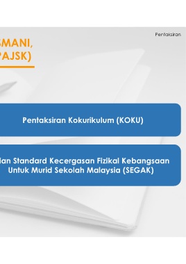 Pentaksiran PENTAKSIRAN AKTIVITI JASMANI, SUKAN & KOKURIKULUM (PAJSK) Pentaksiran Kokurikulum (KOKU) PAJSK Ujian Standard Kecergasan Fizikal Kebangsaan Untuk Murid Sekolah Malaysia (SEGAK)
