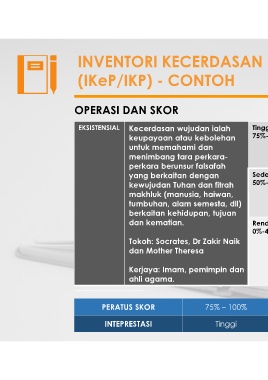 EKSISTENSIAL Kecerdasan wujudan ialah Tinggi Individu ini mempunyai kecerdasan yang tinggi dalam