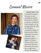 Samuel Moore was a wonderful student. He loves to read anything he can get his hands on. Samuel is going to continue to learn and grow in the coming years. He will be attending a community college at least one year before selecting a four-year university. Sam intends to obtain a degree in Library Science with a focus in Archival Science. His dream job would be to work in the Library of Congress.