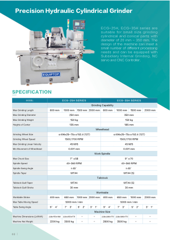 ECG-25H, ECG-35H series are suitable for small size grinding cylindrical and conical parts with diameter of 20 mm ~ 350 mm. The design of the machine can meet a small number of different processing needs and can be equipped with Subsidiary Internal Grinding, NC servo and CNC Controller.