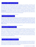 THEHOLYSPIRITISTHETHIRD PERSON OFTHEGODHEAD.HEISCO-EQUAL,CO-ETERNALAND C O -E X IS T E N T W IT H T H E F A T H E R A N D W IT H T H E S O N . H IS M IN IS T R Y U P O N T H E E A R T H IS T O C O N V IC T AND COVERTMAN ASW ELLASBETHEGREATPARACLETE(COMFORTER,COUNSELOR,HELPER, INTERCESSOR,ADVOCATE,STRENGTHENERANDSTANDBY)TOTHECHURCH.THEBAPTISM OFTHE HOLYSPIRITANDFIREISAGIFTFROM GODASPROMISEDBYTHELORDJESUSTOALLBELIEVERS ANDISRECEIVEDSUBSEQUENTTOANDINADDITIONTOTHENEW BIRTH.THEINITIALEVIDENCEOF SPEAKING W ITH OTHER TONGUES,ASW ELLASOTHER MANIFESTATIONSDESCRIBED IN ACTS2,