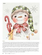 Use the Espresso pencil to shade new areas and reinforce and deepen some of the shaded areas. Start with the stocking hat and work down the design. Lightly shade the bottom of each black check on the hat, the sides and a bit on bottom edge of the hat trim, a touch around the eyes, and the bottom of the carrot nose. Lightly shade under the chin, side corners of the body, and a touch on the lower tips of the stars. Continuing with the Espresso pencil, lightly shade the base and tips of the candy canes (especially the one in back), on the inside curve of the candy canes, and the inside edge of each small red candy cane stripe. Lightly repeat the darkest shading on the candy bag, the darkest areas of each section of the scarf, and the fringe of the scarf.