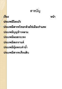 สารบัญ เรื่อง หน้า ประเพณีโยนบัว ประเพณีสารทไทยกล้วยไข่เมืองก าแพง ประเพณีบุญข้าวหลาม ประเพณีลอยกระทง ประเพณีสงกรานต์ ประเพณีอุ้มพระด าน ้า ประเพณีสารทเดือนสิบ