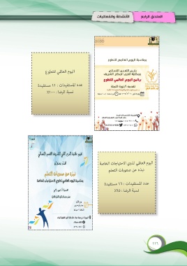 الأنشطة والفعاليات الملحق الرابع اليوم العالمي للتطوع عدد المستفيدات 11 :مستفيدة نسبة الرضا %100 : اليوم العالمي لذوي الاحتياجات الخاصة نبذه عن صعوبات التعلم عدد المستفيدات 16 :مستفيدة نسبة الرضا %95 : 116