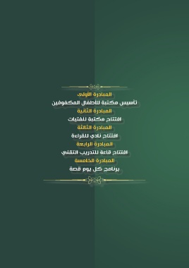 المبادرة الأولى تأسيس مكتبة للأطفال المكفوفين المبادرة الثانية افتتاح مكتبة للفتيات المبادرة الثالثة افتتاح نادي للقراءة المبادرة الرابعة افتتاح قاعة للتدريب التقني المبادرة الخامسة برنامج كل يوم قصة