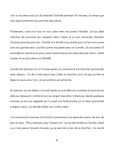 Camille est allé plus loin, 2 minutes après, j'ai commencé à la chercher sauf qu'elle avait disparu. J'ai dit à mes sœurs que j'allais la chercher pour ne pas qu'elle se fasse du souci pour moi. Je suis partie à sa recherche.