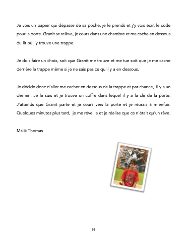 Je décide donc d'aller me cacher en dessous de la trappe et par chance, il y a un chemin. Je le suis et je trouve un coffre dans lequel il y a la clé de la porte. J’attends que Granit parte et je cours vers la porte et je réussis à m'enfuir. Quelques minutes plus tard, je me réveille et je réalise que ce n'était qu’un rêve.