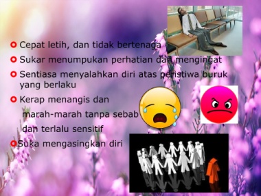 Cepat letih, dan tidak bertenaga Sukar menumpukan perhatian dan mengingat Sentiasa menyalahkan diri atas peristiwa buruk yang berlaku Kerap menangis dan marah-marah tanpa sebab dan terlalu sensitif Suka mengasingkan diri