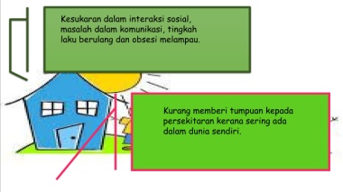 Kesukaran dalam interaksi sosial, masalah dalam komunikasi, tingkah laku berulang dan obsesi melampau. Kurang memberi tumpuan kepada persekitaran kerana sering ada dalam dunia sendiri.