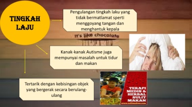 Pengulangan tingkah laku yang TINGKAH tidak bermatlamat sperti menggoyang tangan dan LAJU menghantuk kepala Kanak-kanak Autisme juga mempunyai masalah untuk tidur dan makan Tertarik dengan kebisingan objek yang bergerak secara berulang- ulang