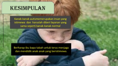 KESIMPULAN Kanak-kanak autismemerupakan insan yang istimewa dan haruslah diberi layanan yang sama seperti kanak-kanak normal Berharap ibu bapa tabah untuk terus menjaga dan mendidik anak-anak yang beristimewa.