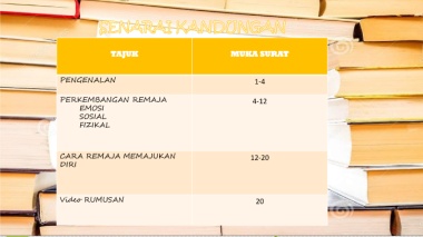 TAJUK MUKA SURAT PENGENALAN 1-4 PERKEMBANGAN REMAJA 4-12 EMOSI SOSIAL FIZIKAL CARA REMAJA MEMAJUKAN 12-20 DIRI Video RUMUSAN 20