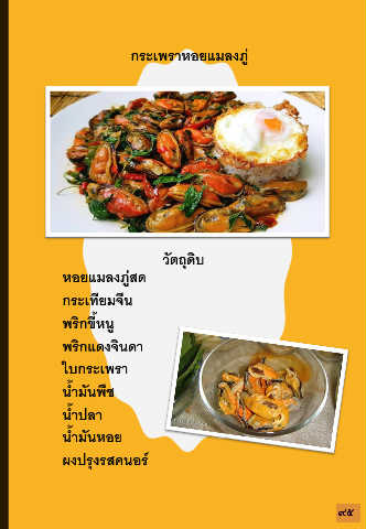กระเพราหอยแมลงภู่ วัตถุดิบ หอยแมลงภู่สด กระเทียมจีน พริกขี้หนู พริกแดงจินดา ใบกระเพรา น ้ามันพืช น ้าปลา น ้ามันหอย ผงปรุงรสคนอร์ ๙๕