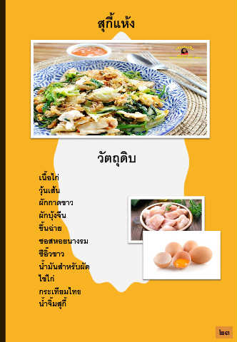 สุกี้แห้ง วัตถุดิบ เนื้อไก่ วุ้นเส้น ผักกาดขาว ผักบุ้งจีน ขึ้นฉ่าย ซอสหอยนางรม ซีอิ๊วขาว น ้ามันส าหรับผัด ไข่ไก่ กระเทียมไทย น ้าจิ้มสุกี้ ๒๓