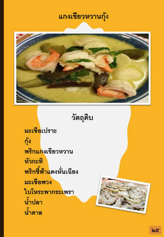 แกงเขียวหวานกุ้ง วัตถุดิบ มะเขือเปราะ กุ้ง พริกแกงเขียวหวาน หัวกะทิ พริกชี้ฟ้าแดงหั่นเฉียง มะเขือพวง ใบโหระพากระเพรา น ้าปลา น ้าตาล ๒๕