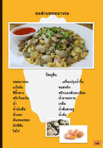 ออส่วนหอยนางรม วัตถุดิบ หอยนางรม เครื่องปรุงน ้าจิ้ม แป้งมัน ซอสพริก ซีอิ๊วขาว พริกแดงสับละเอียด พริกไทยป่น น ้าตาลทราย น ้า เกลือ น ้ามันพืช น ้าส้มสายชู ถั่วงอก น ้าต้ม ต้นหอมซอย ผักชีสับ ไข่ไก่ ๓๕