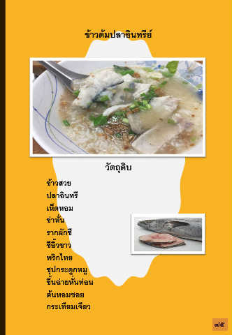 ข้าวต้มปลาอินทรีย์ วัตถุดิบ ข้าวสวย ปลาอินทรี เห็ดหอม ข่าหั่น รากผักชี ซีอิ๊วขาว พริกไทย ซุปกระดูกหมู ขึ้นฉ่ายหั่นท่อน ต้นหอมซอย กระเทียมเจียว ๗๕