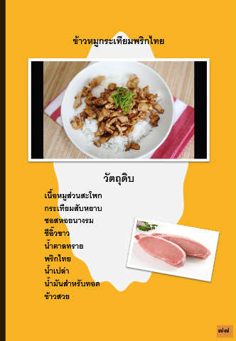 ข้าวหมูกระเทียมพริกไทย วัตถุดิบ เนื้อหมูส่วนสะโพก กระเทียมสับหยาบ ซอสหอยนางรม ซีอิ๊วขาว น ้าตาลทราย พริกไทย น ้าเปล่า น ้ามันส าหรับทอด ข้าวสวย ๗๗